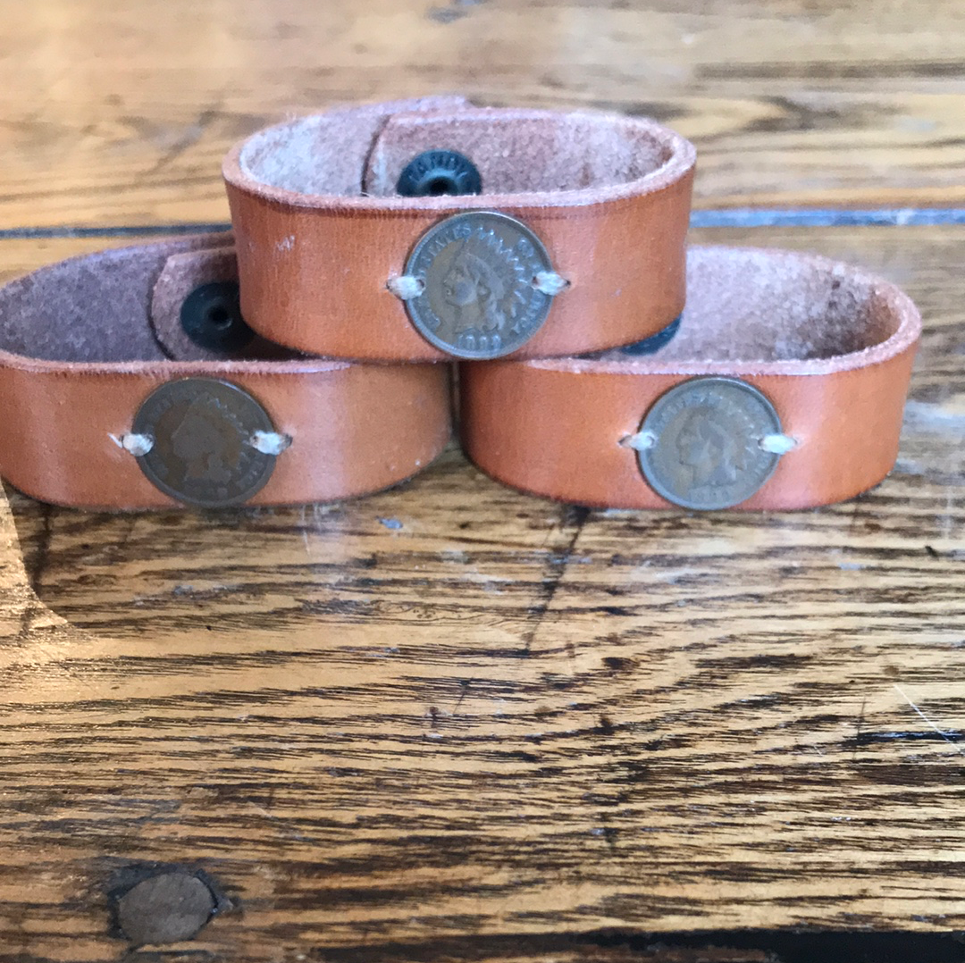 These are leather cuffs with a 120 year old Indian Head penny pendant.